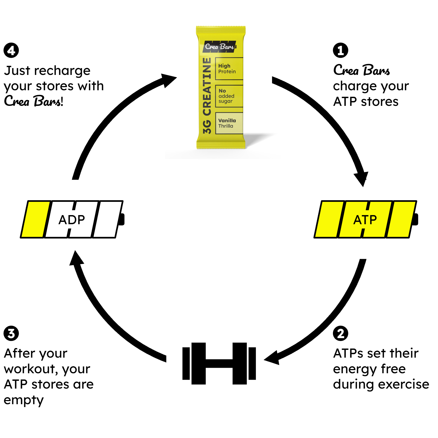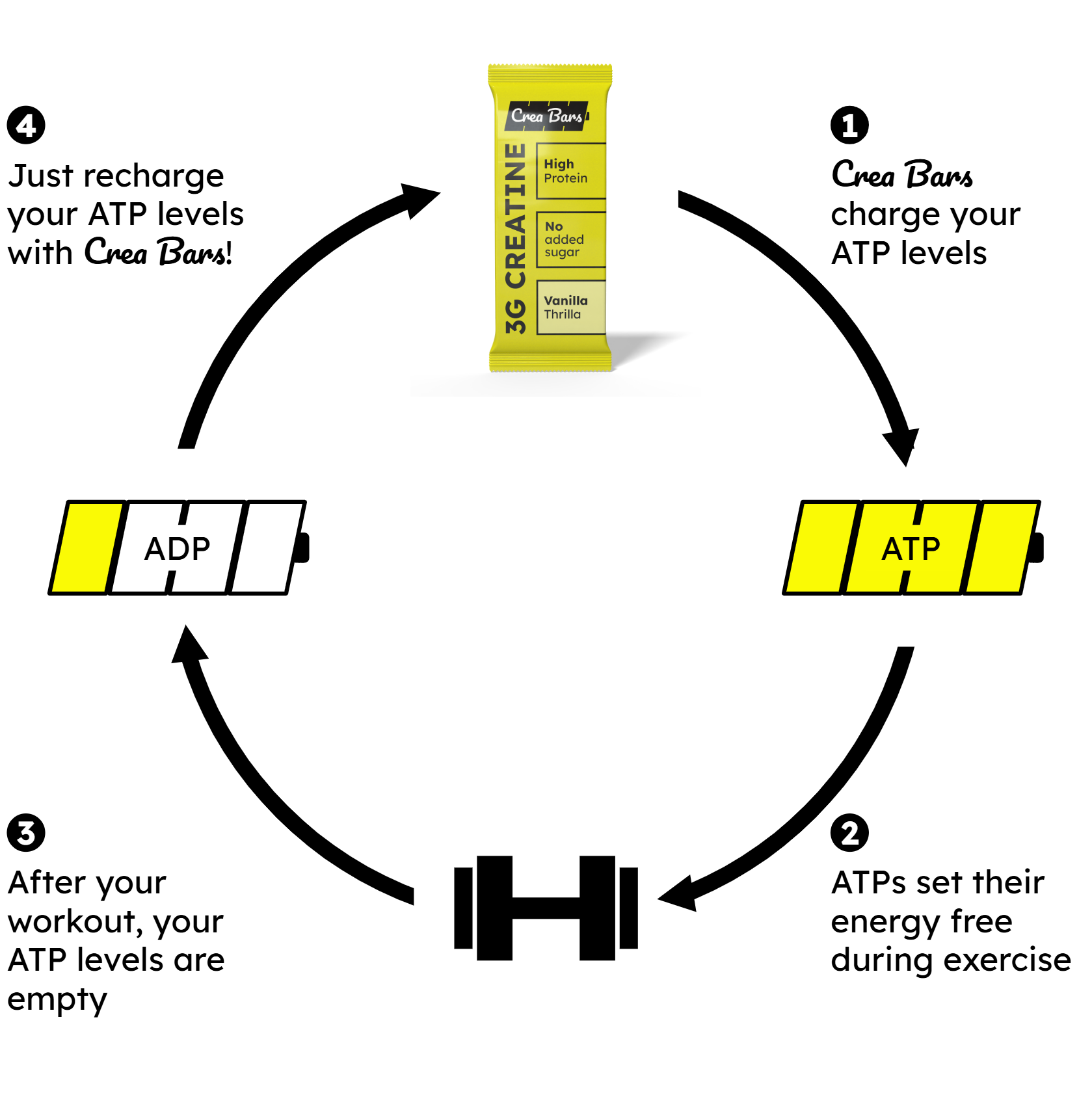 - The creatine in Crea Bars increases your phosphocreatine levels, allowing you to produce more ATP energy to fuel your muscles during high-intensity exercise